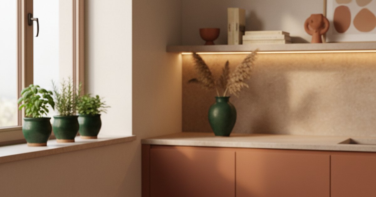 | Ciepły piaskowy | Oliwkowa zieleń (np. doniczki), mosiężne uchwyty | Drewniane fronty, blat z kamienia |